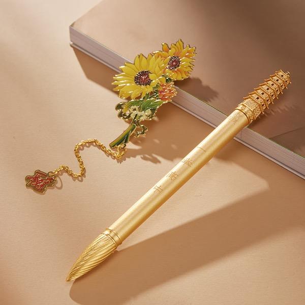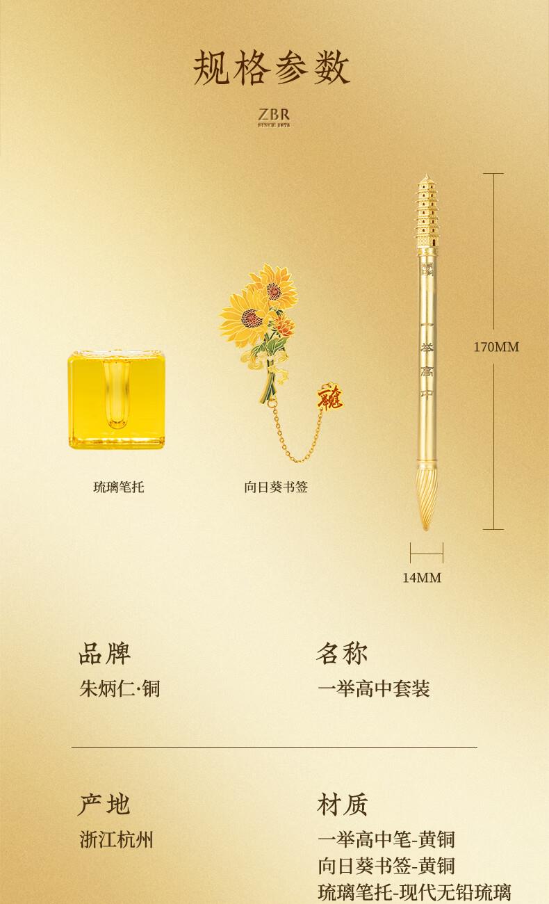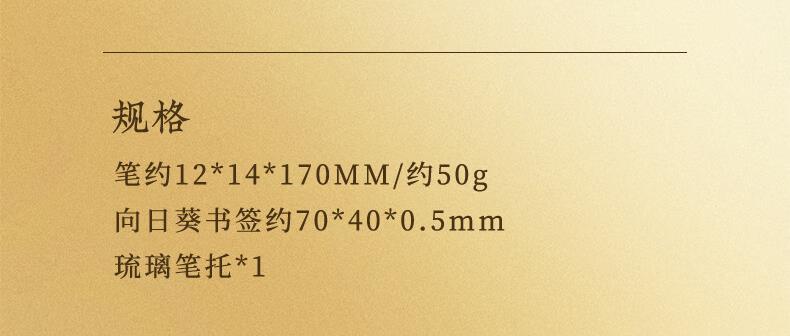 規(guī)格:一舉高中筆約12*14*170MM/約50G*1 向日葵書簽約70*40*0.5MM*1 琉璃筆托* 材質(zhì):一舉高中筆/向日葵書簽-黃銅 琉璃筆托-現(xiàn)代無鉛琉璃