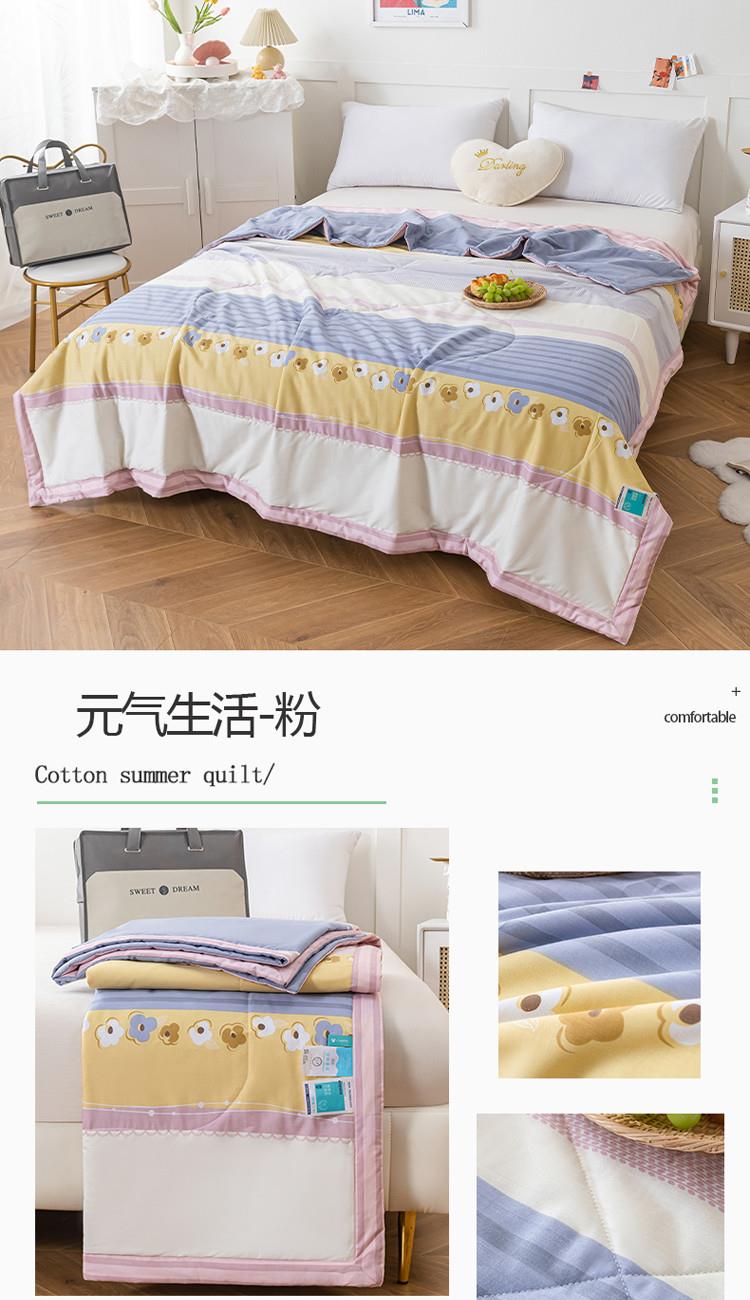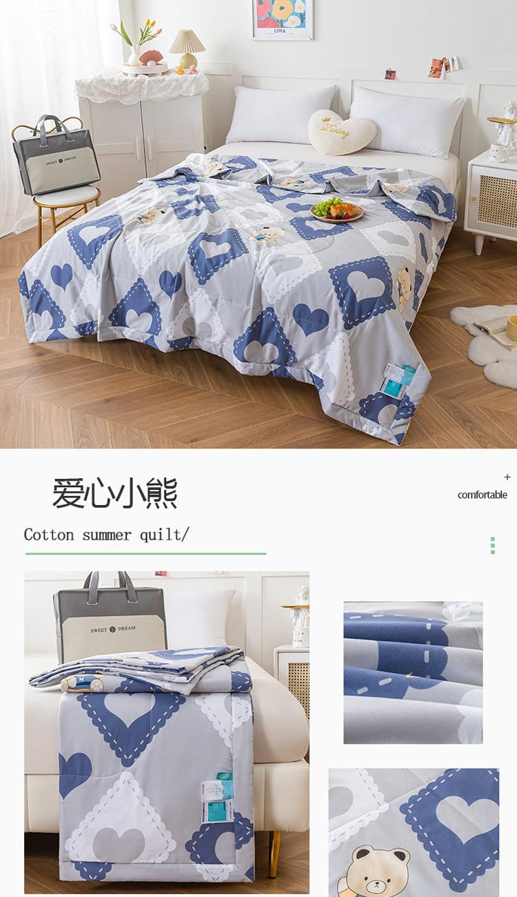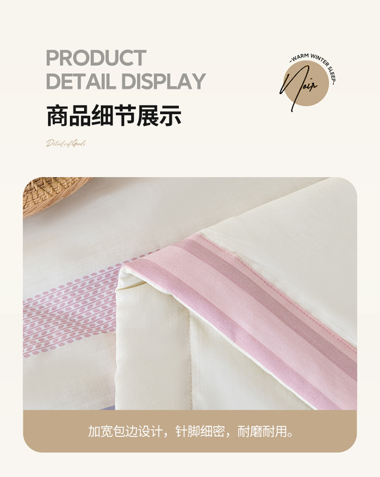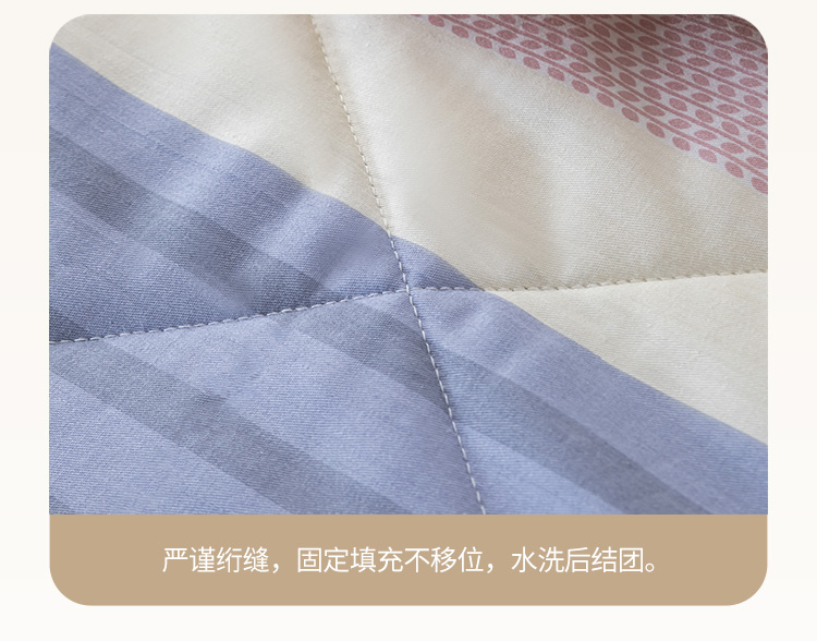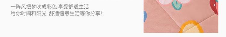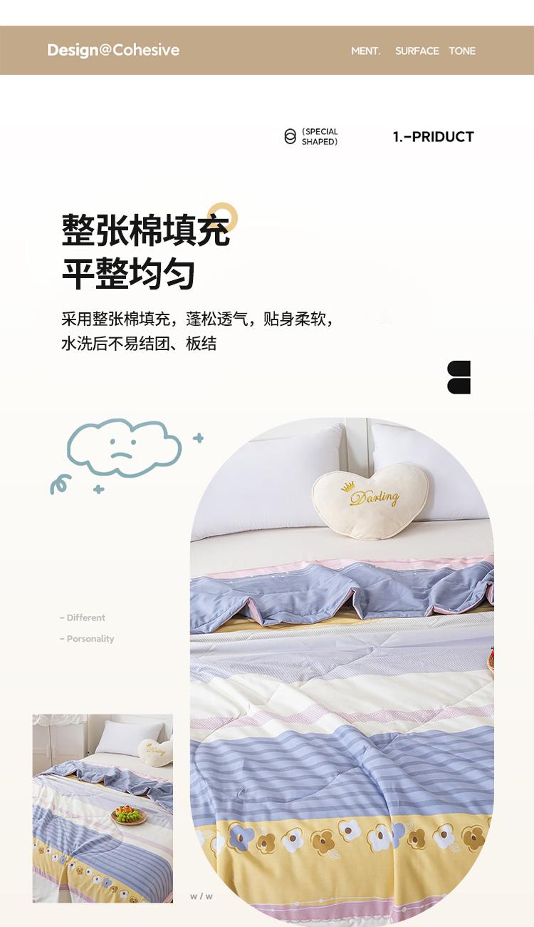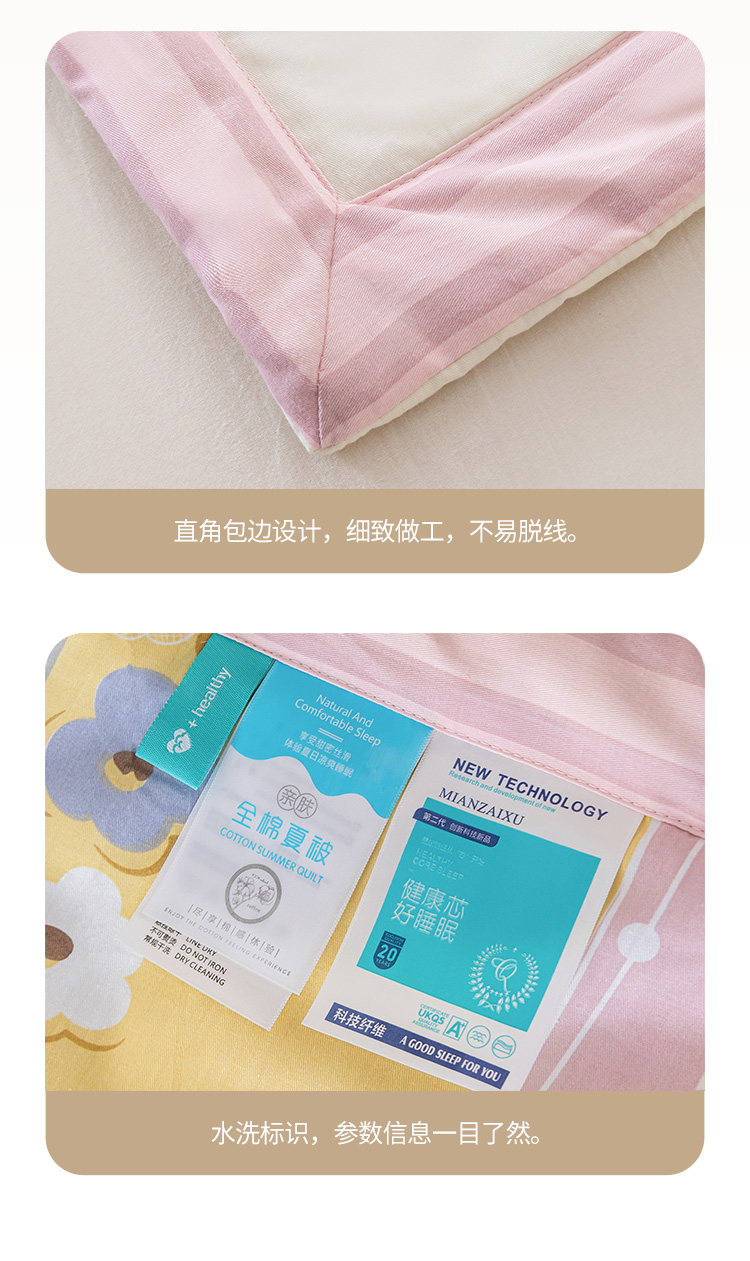 規(guī) 格:150*200cm 花 型:愛心小熊、草莓小兔、克里斯、元錦、元?dú)馍?粉 元?dú)馍?藍(lán) 面 料: 全棉 填充物:整張羽絲絨棉(聚酯纖維) 工 藝: 定位絎縫/手工包邊 全棉面料的印花立體感很強(qiáng)觸感舒適,棉質(zhì)感帶來的透氣。全棉面料不起球、不縮水、不掉色、耐洗,抗皺;手工包邊更具時(shí)尚大方,親膚透氣,貼身,更耐用,機(jī)洗手機(jī)均可,貼合性好,緊密針腳絎縫。