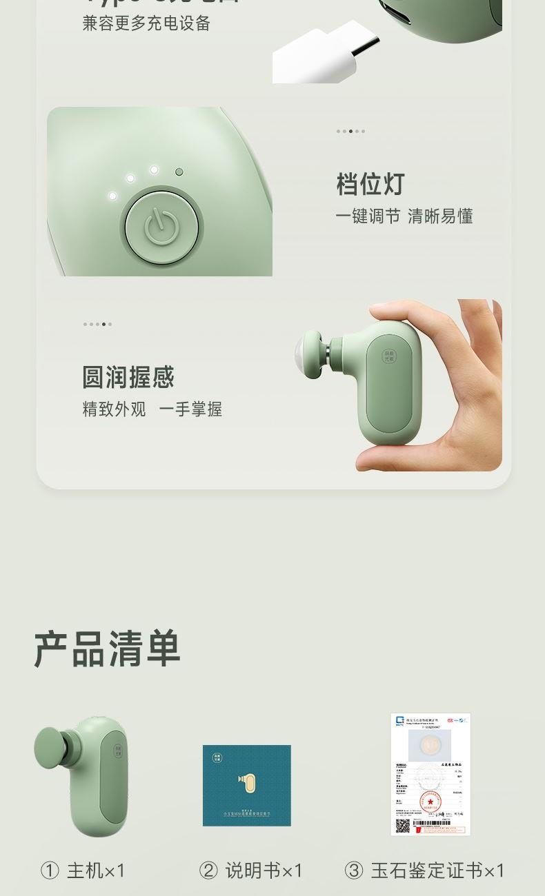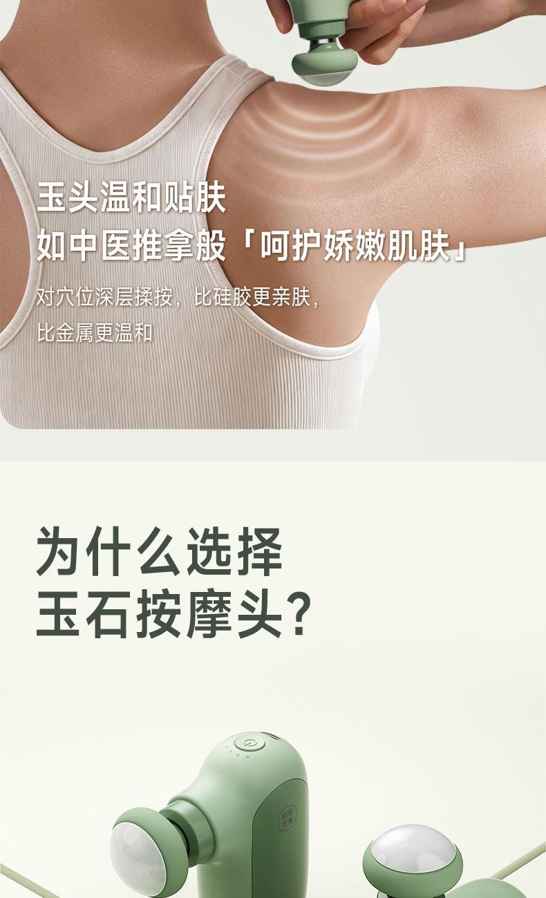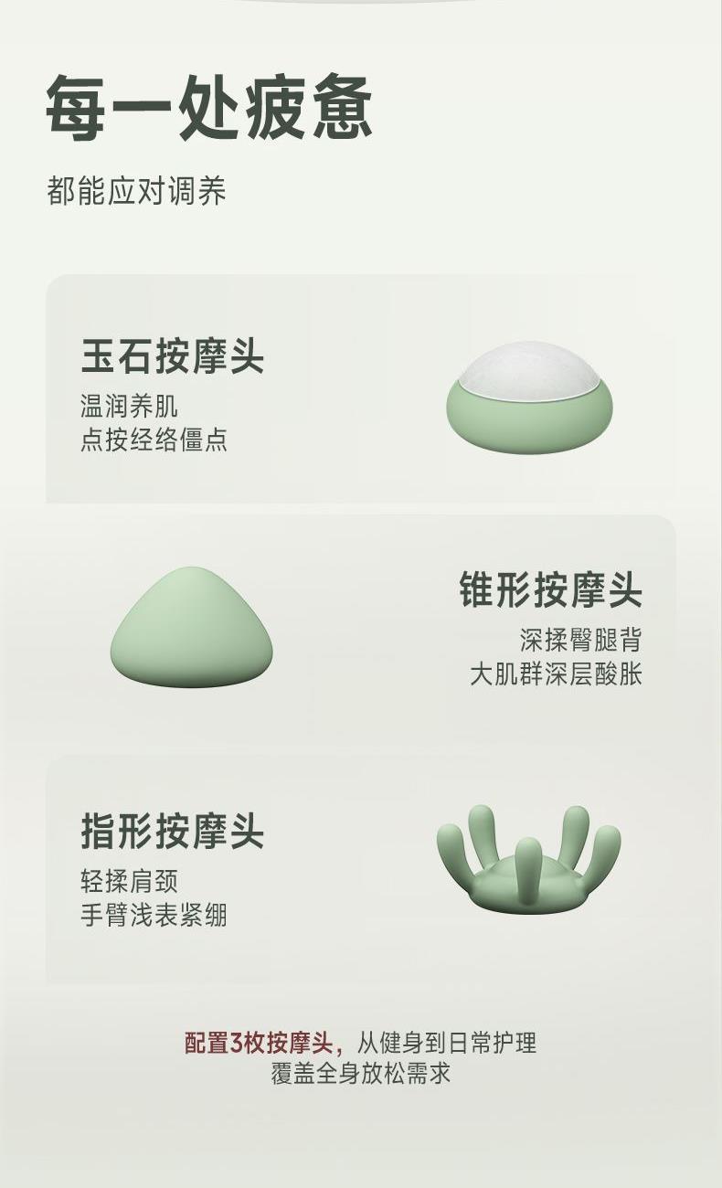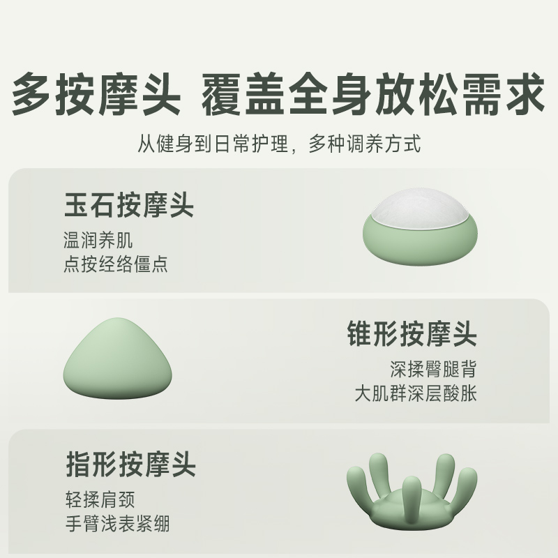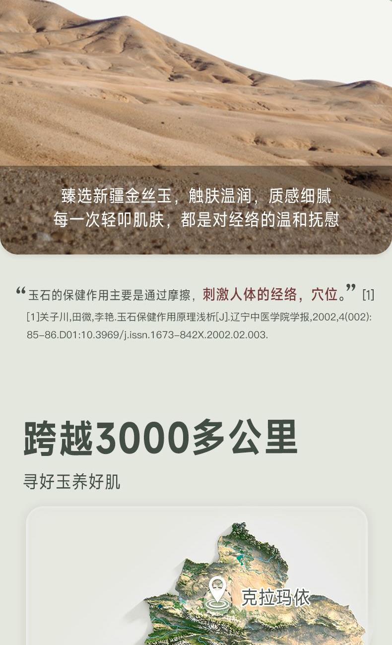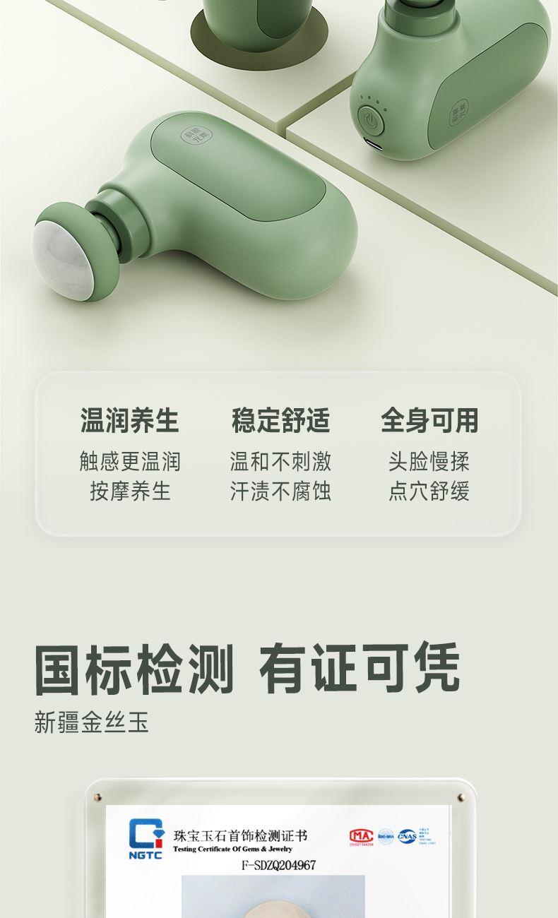 1、天然金絲玉材質(zhì),溫潤養(yǎng)肌,疏通經(jīng)絡(luò),緩解深度緊繃,一機(jī)配備3款按摩頭(玉石、錐形、指形),全面覆蓋身體與面部精細(xì)按摩放松需求;