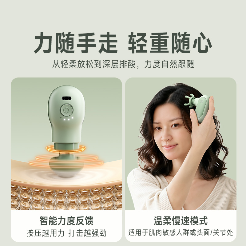 2、智能壓力識別,前三個檔位可通過壓力感應(yīng)自動調(diào)整捶打,力度自然跟隨,享受從輕柔放松到深層排酸,無縫切換不卡頓的專業(yè)按摩體驗(yàn)。