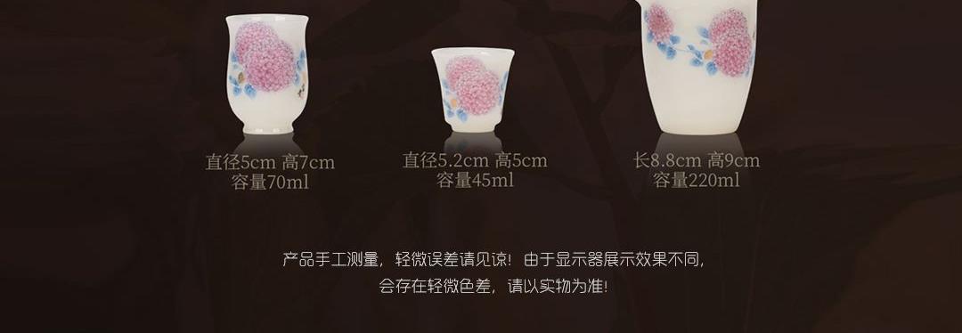 配置1:茶碗*1,茶杯*6,主人杯*1,茶海*1,過濾組*1. 配置2:茶壺*1,茶杯*6,主人杯*1,茶海*1,過濾組*1. 尺寸:茶壺12.3*7cm 容量170ml, 茶碗11.2*8.8cm 容量140ml, 茶杯5.2*5cm 容量45ml, 主人杯5*7cm 容量70ml, 茶海8.8*9cm 容量220ml, 過濾組8.3*5.8cm。 禮盒:43*12.5*28cm。