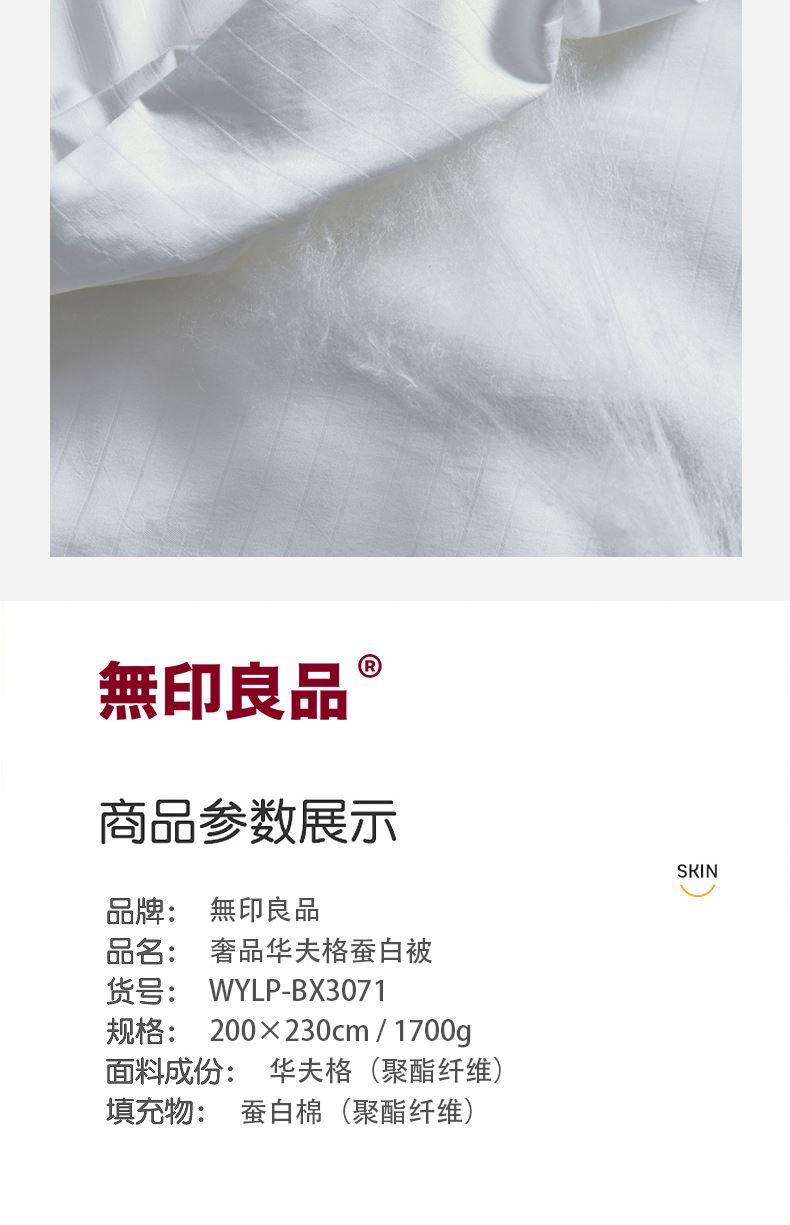 規(guī) 格:200×230cm 克重:1700g 面 料:華夫格(聚酯纖維) 填 充:蠶白棉(聚酯纖維) “無印良品”大染無印,優(yōu)良品質(zhì)的產(chǎn)品是年輕人喜歡的,“無印”設(shè)計(jì), 優(yōu)雅 , 質(zhì)樸 , 自然 , 是無印良品的初心與追求。讓體驗(yàn)更舒適。享受簡約健康生活,走進(jìn)無印,上善若水,大愛無疆,創(chuàng)新讓生活更精彩。