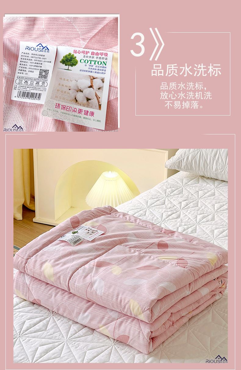 2.整張羽絲絨填充,整張棉更加平整挺括,更加耐用,長(zhǎng)期使用都不用擔(dān)心內(nèi)芯纏繞導(dǎo)致結(jié)塊結(jié)板,更不用擔(dān)心跑棉的問(wèn)題,久用也能保持蓬松。直接機(jī)洗手洗均可以
