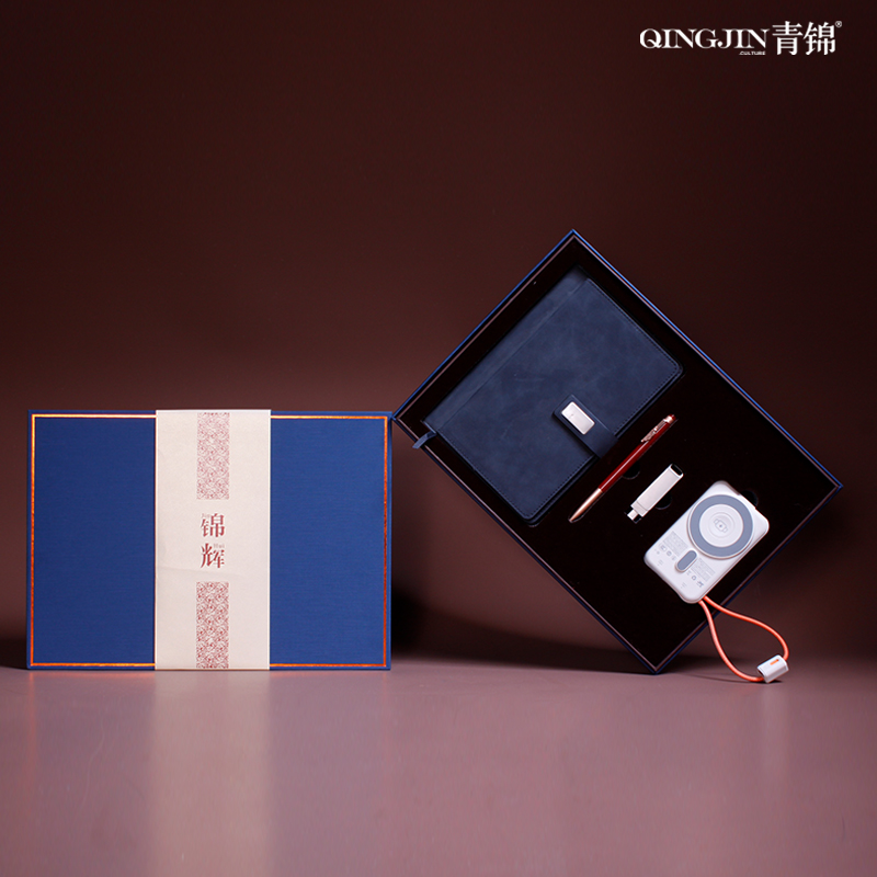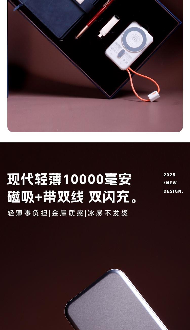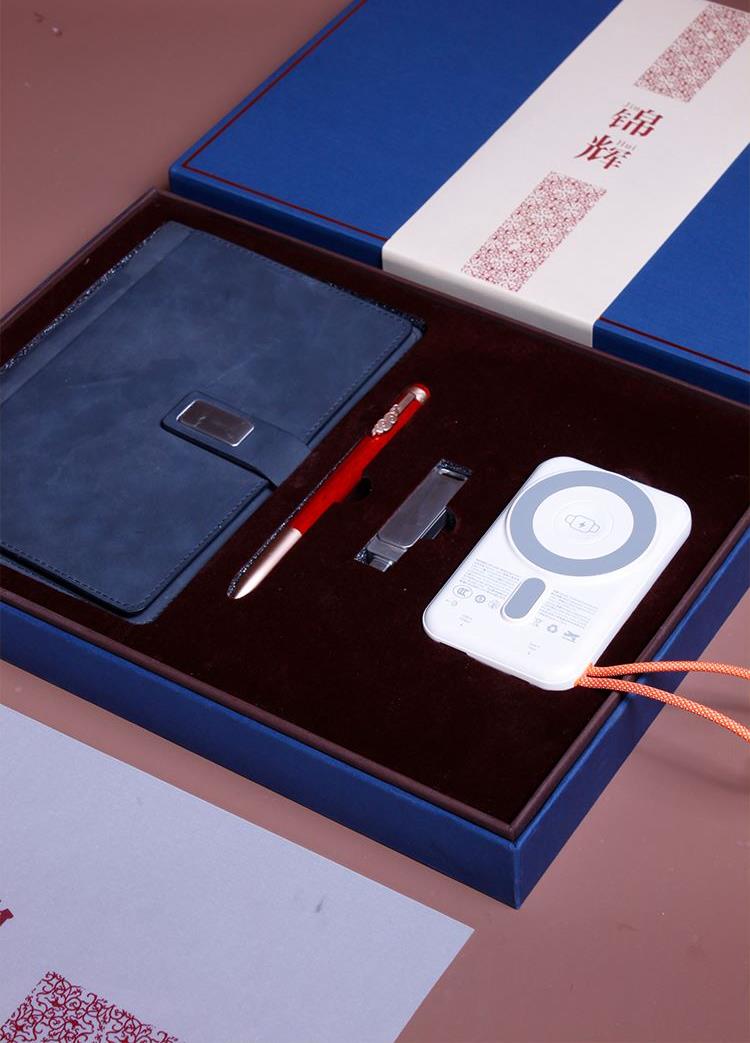 商務(wù)記事本*1;錦云簽字筆;手機(jī)優(yōu)盤*1(64GB支持手機(jī)端/pc端);現(xiàn)代無線磁吸電源*1有3C認(rèn)證(10000毫安超級快充/自帶線);精裝禮盒*1;手提袋*1