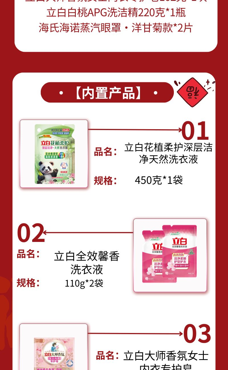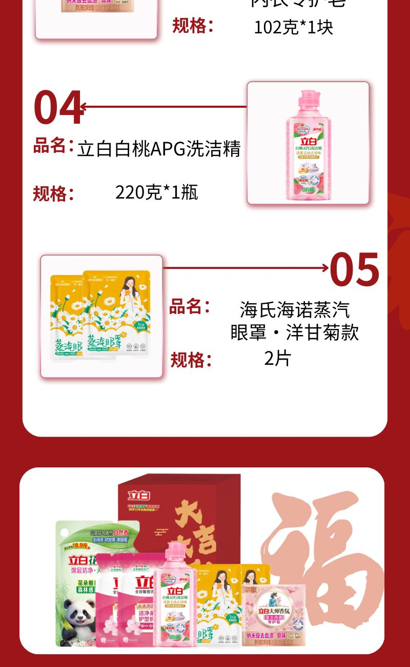 配置: 立白花植柔護深層潔凈天然洗衣液450克*1袋 立白全效馨香洗衣液110g*2袋 立白大師香氛女士內衣專護皂102克*1塊 立白白桃APG洗潔精220克*1瓶 海氏海諾蒸汽眼罩·洋甘菊款*2片 賣點: 可選產品豐富多樣,禮箱隨心組合,多種價位因需而定,充分滿足各種送禮需求,是商務送禮、單位福利的用心之選。