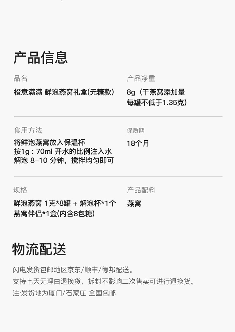 配置:1g*8罐/盒+燜泡杯x1個(gè)、燕窩伴侶x1盒(內(nèi)含8包糖) 配料:燕窩 食用方法:取一瓶鮮泡燕窩于保溫杯中,加入適量開(kāi)水 (建議1克鮮泡燕窩約加入70毫升水或純凈水),適當(dāng)燜泡(建議8-10分鐘)后開(kāi)蓋攪拌均勻,即可享用。 凈含量:8克 保質(zhì)期:18個(gè)月 儲(chǔ)存方法:存放于陰涼干燥處,避免陽(yáng)光直射