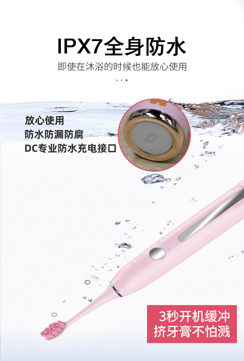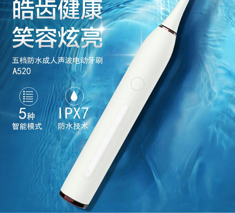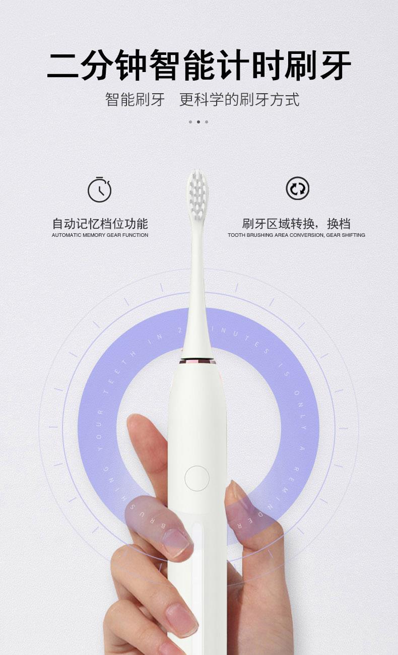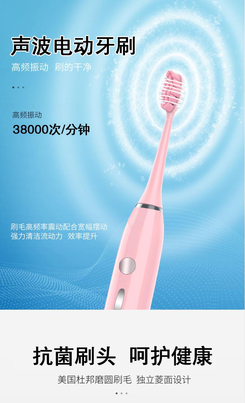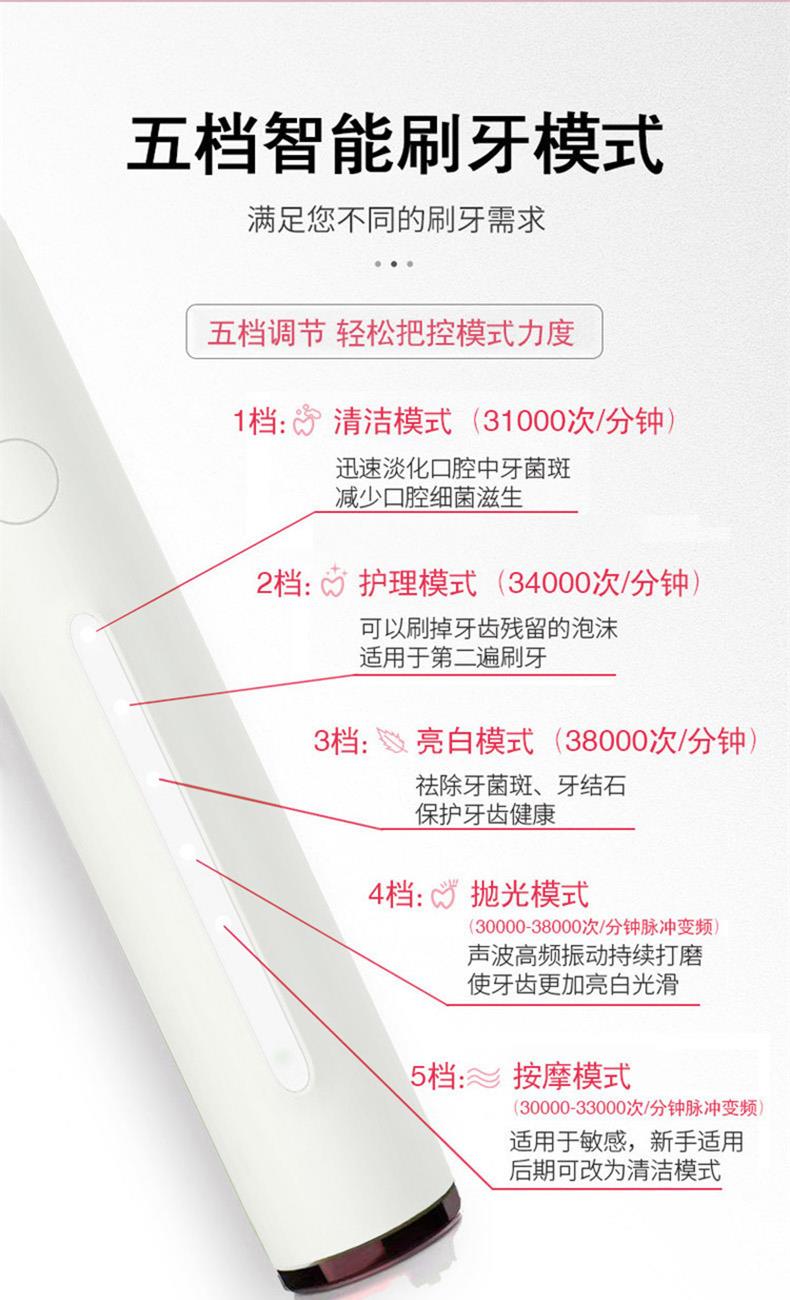 1.五檔潔齒模式,磁懸浮聲波電機(jī),每分鐘38000次/震動(dòng),配置兩個(gè)檔脈沖變頻震動(dòng),針對(duì)不同口腔護(hù)理人士需要,達(dá)到更加有效清潔牙齒污垢,清除牙菌斑效果