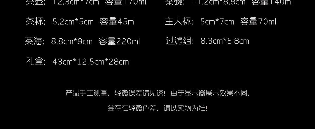 配置:茶壺*1,茶碗*1,茶杯*6,主人杯*1,茶海*1,過(guò)濾組*1. 尺寸:茶壺12.3*7cm 容量170ml, 茶碗11.2*8.8cm 容量140ml, 茶杯5.2*5cm 容量45ml, 主人杯5*7cm 容量70ml, 茶海8.8*9cm 容量220ml, 過(guò)濾組8.3*5.8cm。 禮盒:43*12.5*28cm。
