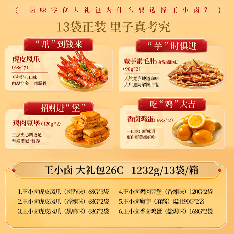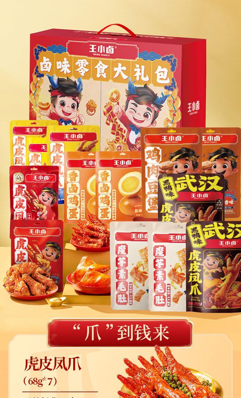 王小鹵虎皮鳳爪鹵香味68g*3袋 王小鹵虎皮鳳爪香辣味68g*2袋 王小鹵虎皮鳳爪黑鴨味68g*2袋 王小鹵雞肉豆堡香辣味120g*2袋 王小鹵魔芋麻醬爆肚90g*2袋 王小鹵香鹵雞蛋(鹽焗味)168g*2袋