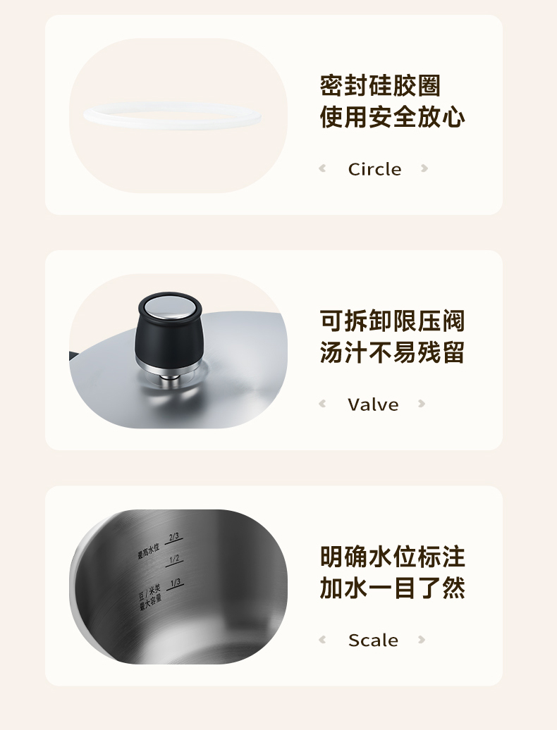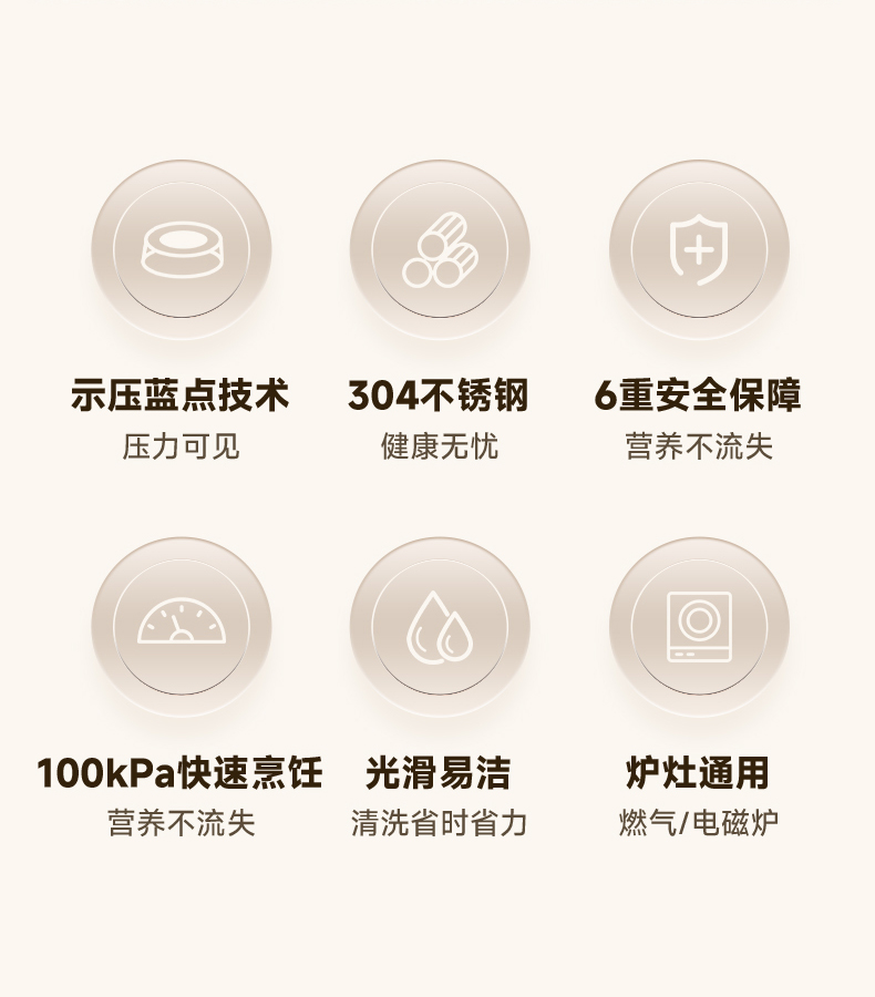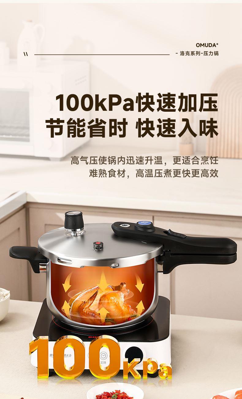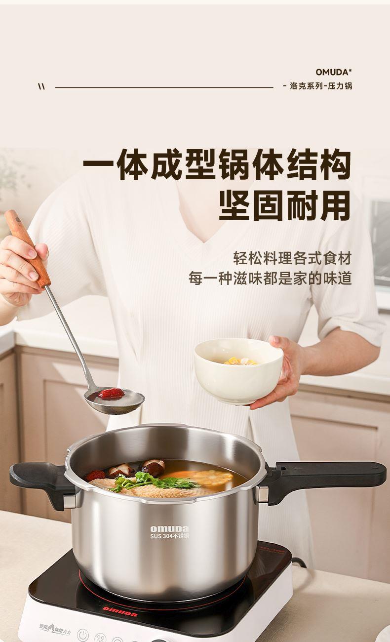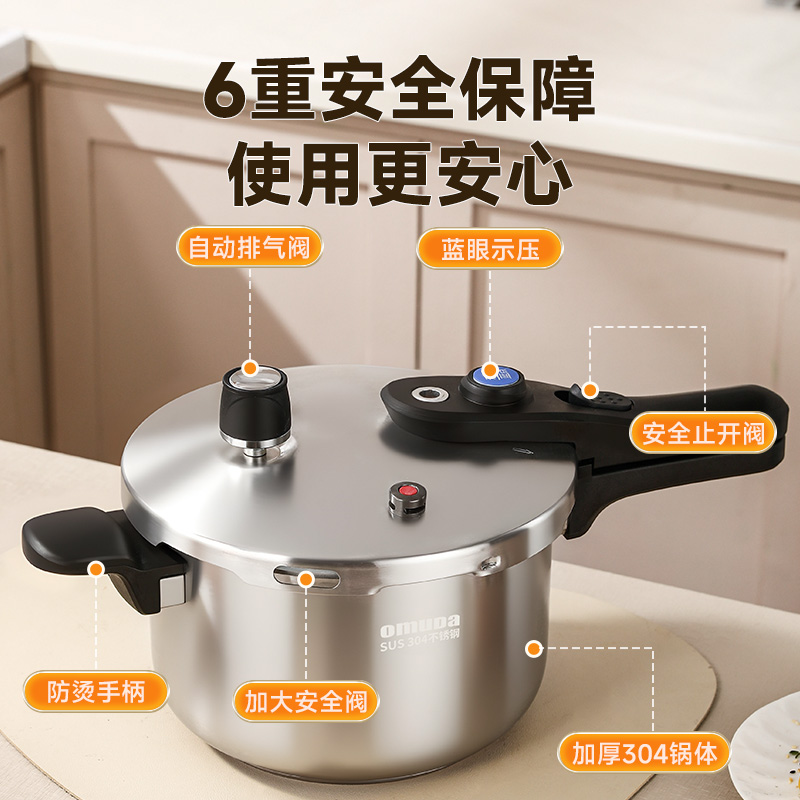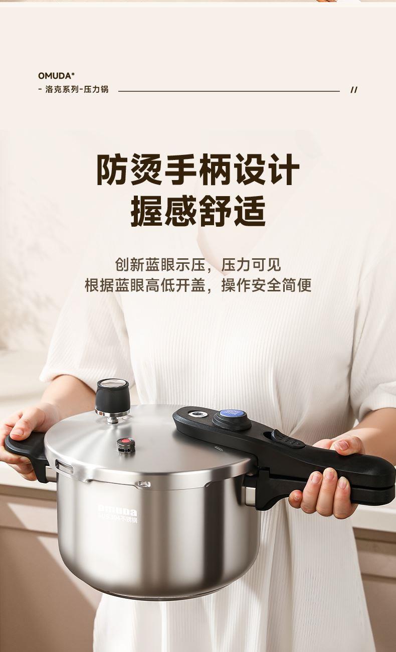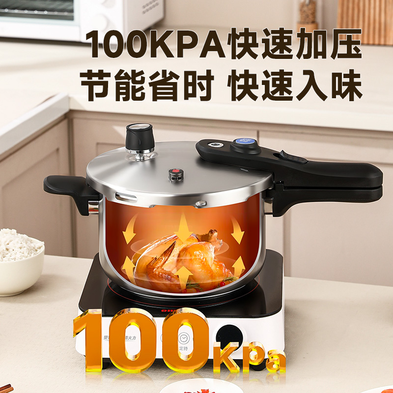 直徑:22cm 容量:5L 凈重:2.44kg 材質(zhì):304不銹鋼 ①食品級304不銹鋼,安全健康 ②100KPa快速加壓,節(jié)能省時(shí),快速入味 ③示壓藍(lán)點(diǎn)技術(shù),壓力輕松掌控 ④6重安全保障,使用更安心 ⑤一體成型鍋體結(jié)構(gòu),堅(jiān)固耐用 ⑥防燙手柄設(shè)計(jì),握感舒適