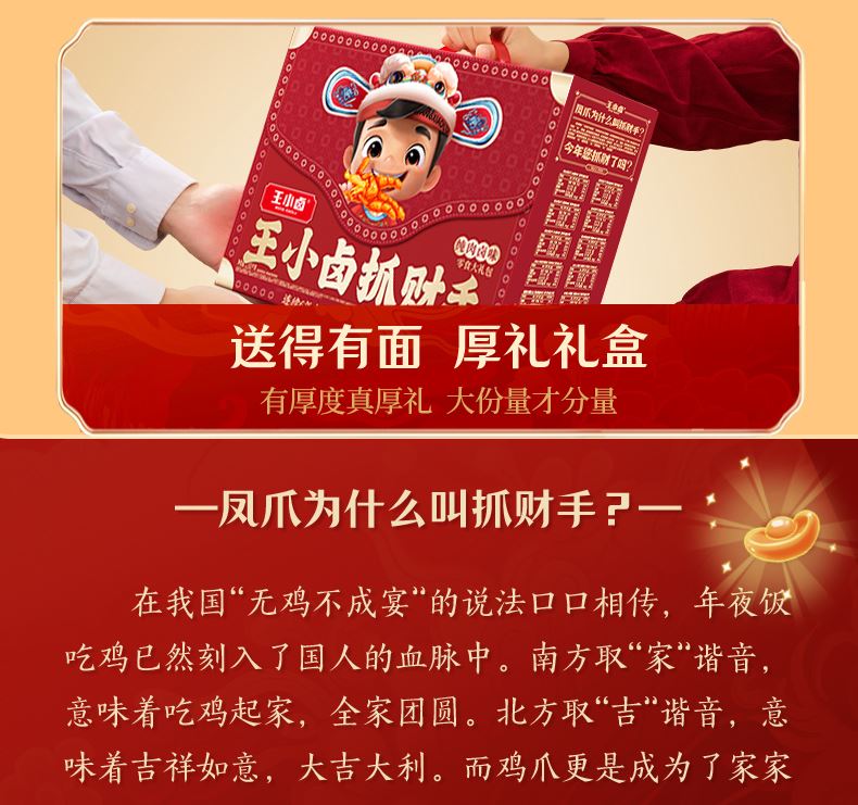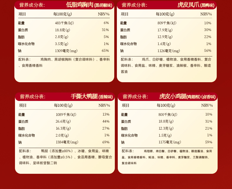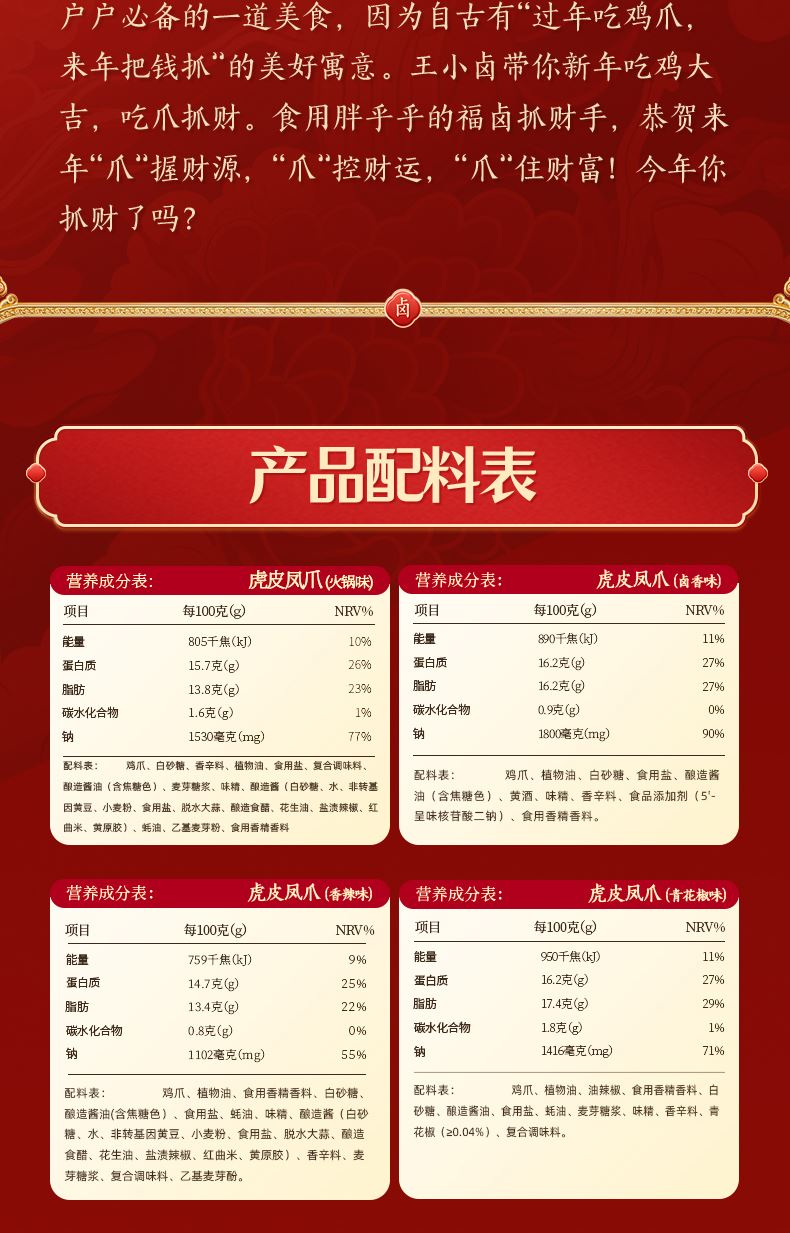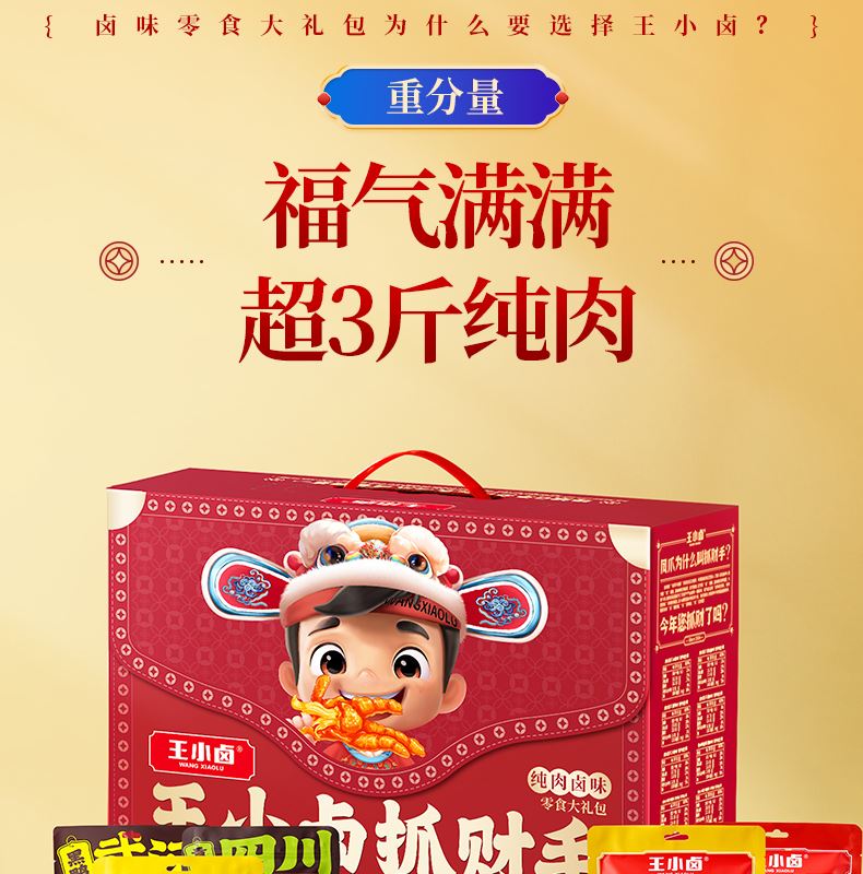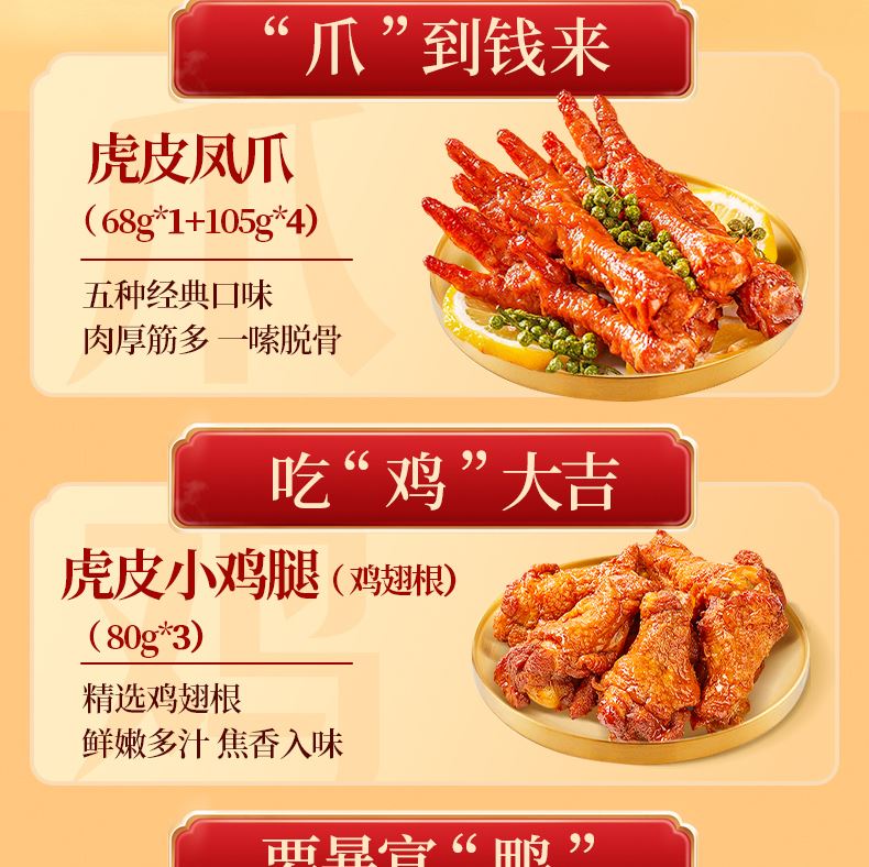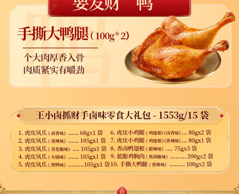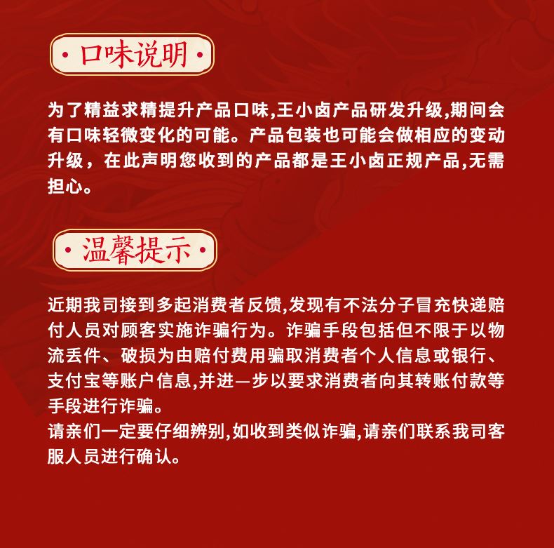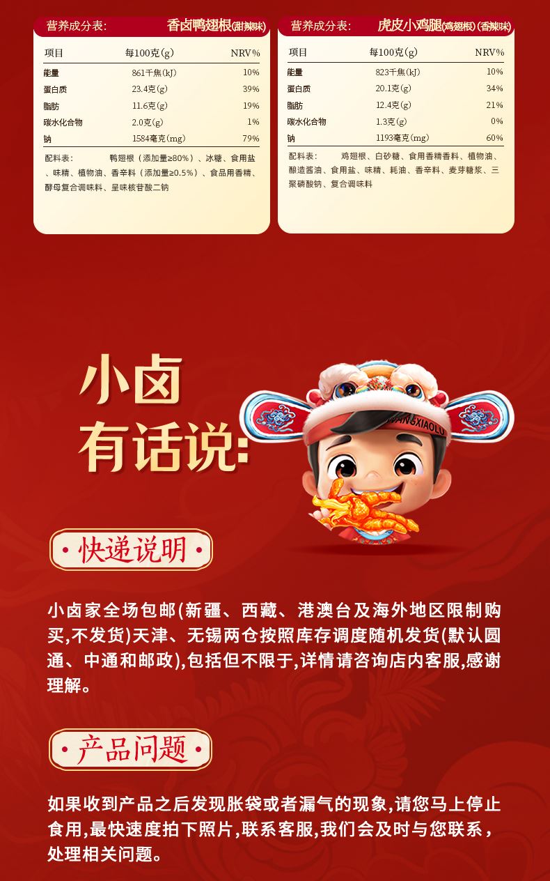 王小鹵雞翅根-鹵香-80g*2 王小鹵雞翅根-香辣-80g 王小鹵虎皮鳳爪-鹵香-68g 王小鹵虎皮鳳爪-青花椒-105g 王小鹵虎皮鳳爪-黑鴨-105g 王小鹵虎皮鳳爪-香辣-105g 王小鹵虎皮鳳爪-火鍋-105g 王小鹵鴨翅根-甜辣-75g*3 王小鹵雞胸肉-黑胡椒-200g*2 王小鹵手撕鴨腿-香辣-100g*2