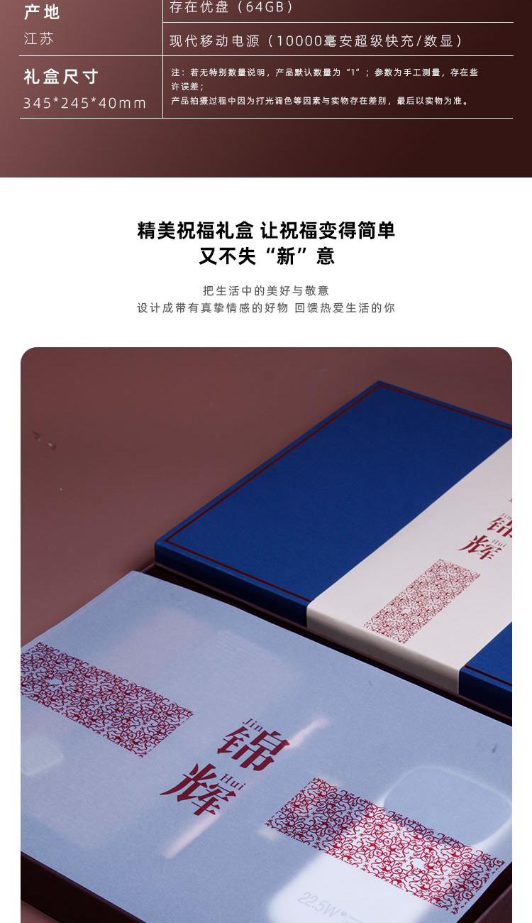 錦呈記事本*1錦云簽字筆;存在優(yōu)盤*1(64GB);現(xiàn)代移動(dòng)電源*1有3C認(rèn)證(10000毫安超級(jí)快充/數(shù)顯);精裝禮盒*1 ;手提袋*1