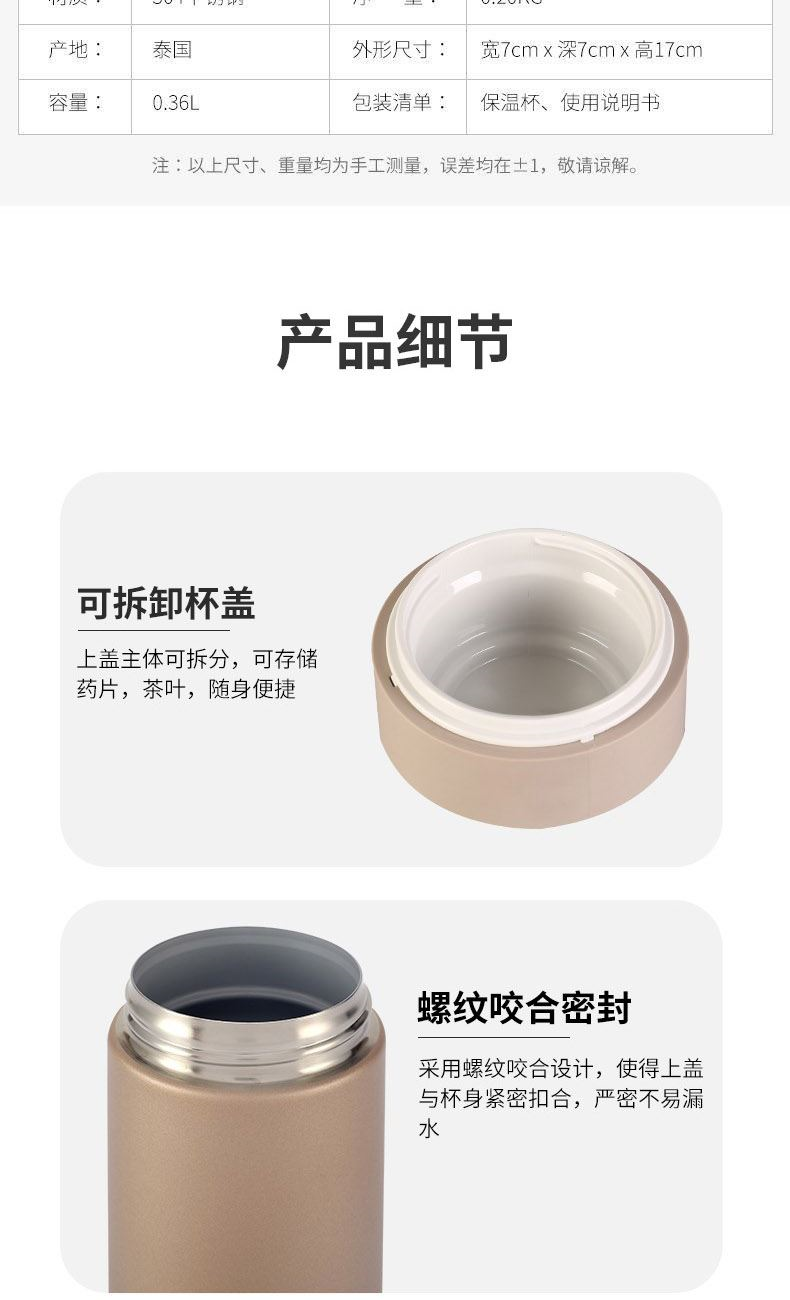 顏 色:金色/棕黑/紅色/粉色 容 量:500ml 類 型:旋蓋杯 帶茶隔 材 質(zhì):304不銹鋼 保 溫:6小時約60°C 保 冷:6小時約10°C以下 產(chǎn) 地:泰國