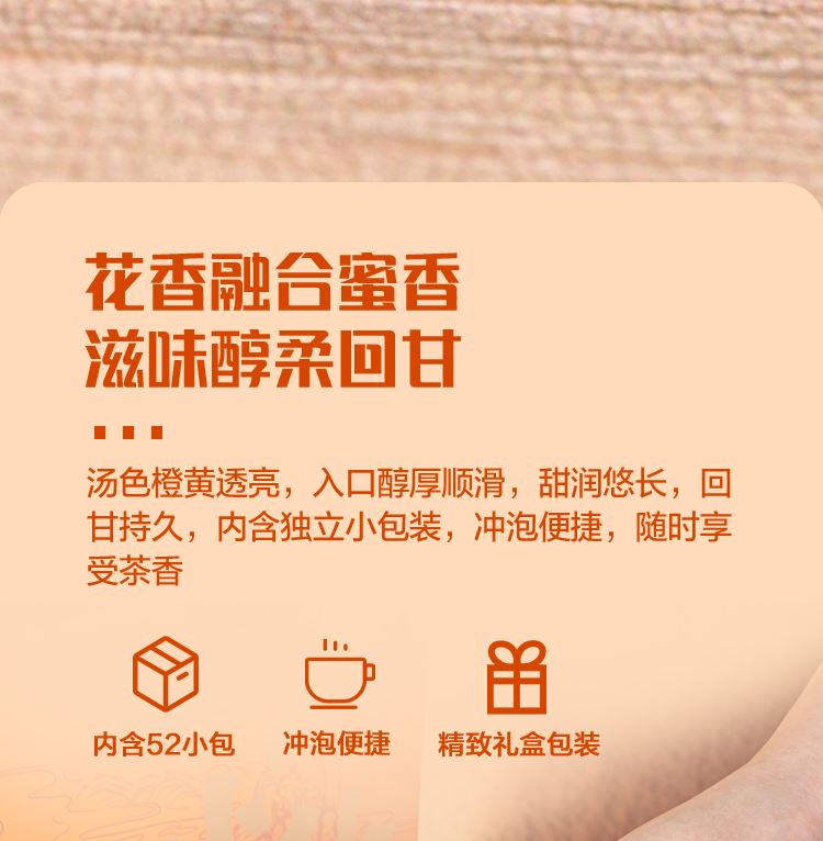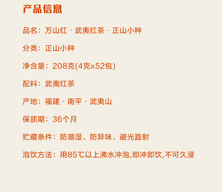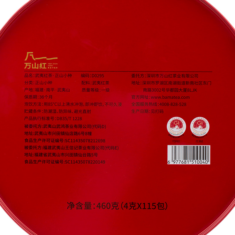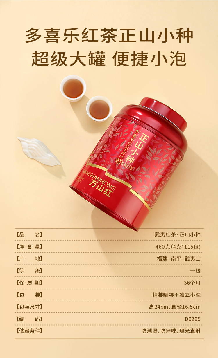 凈含量:208克(4g*52包) 條形碼:6977681511153 保質(zhì)期:36個(gè)月 原料產(chǎn)地:福建·南平·武夷山 貯藏條件:防潮濕、防異味、避光直射、冷藏為宜 凈含量:正山小種單罐460克