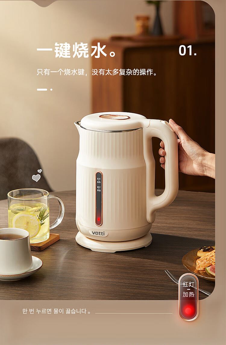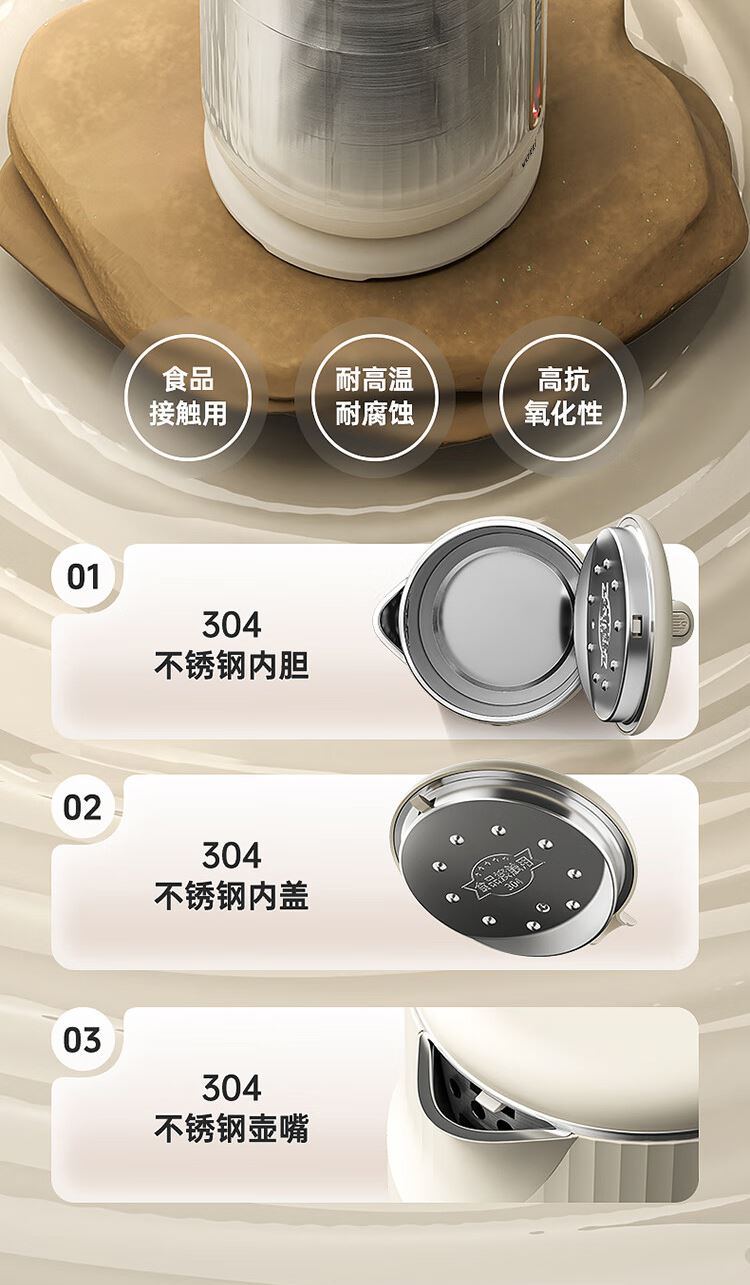 1.大容量:1.8L大容量,一次燒水滿足全家暢飲。 2.極速加熱:1500W大功率,迅速沸騰,無需漫長等待。 3.安全材質(zhì):精選304不銹鋼,食品級接觸材質(zhì) 4.堅固耐用:優(yōu)質(zhì)不銹鋼打造,經(jīng)久耐用,品質(zhì)之選。
