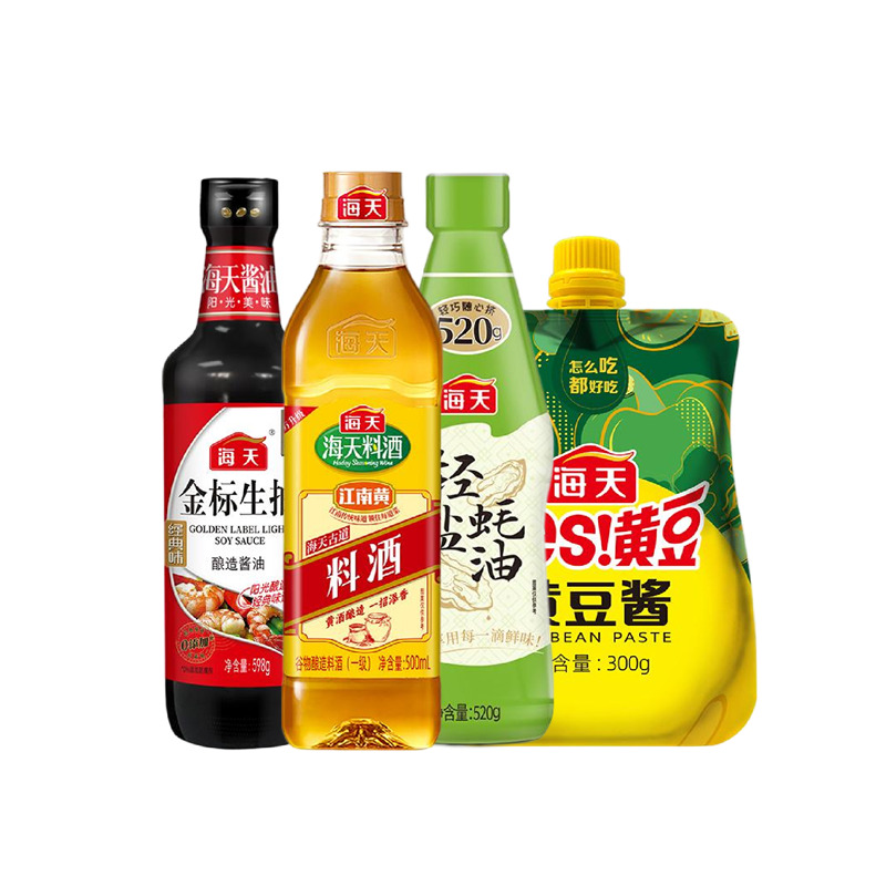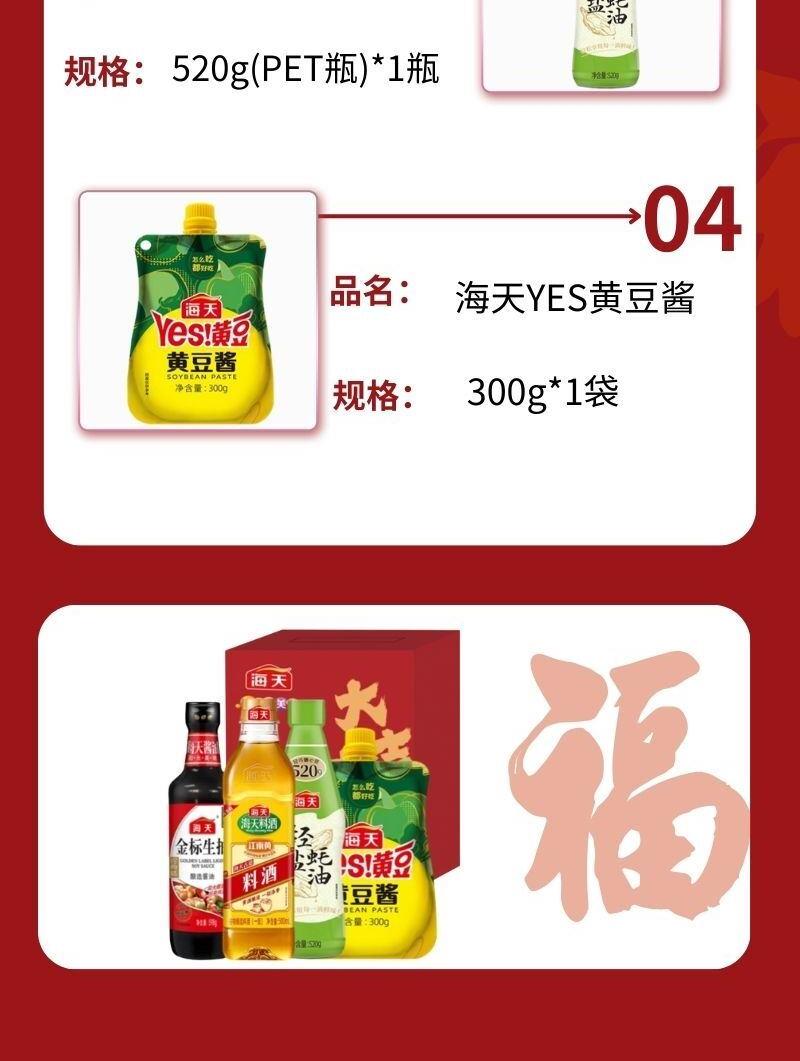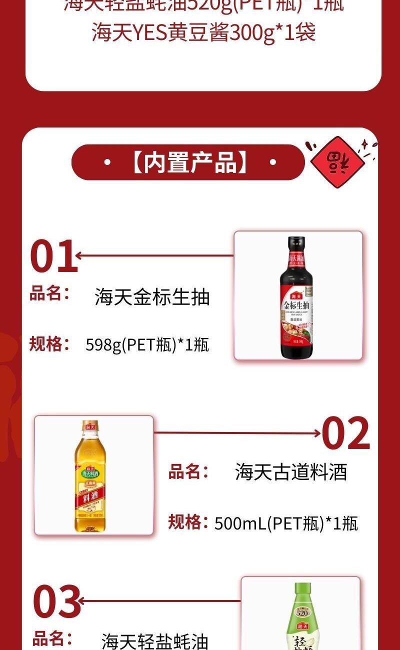 配置: 海天金 標生抽598g(PET瓶)*1瓶 海天古道料酒500mL(PET瓶)*1瓶 海天輕鹽蠔油520g(PET瓶)*1瓶 海天YES黃豆醬300g*1袋 賣點: 可選產(chǎn)品豐富多樣,禮箱隨心組合,多種價位因需而定,充分滿足各種送禮需求,是商務送禮、單位福利的用心之選。