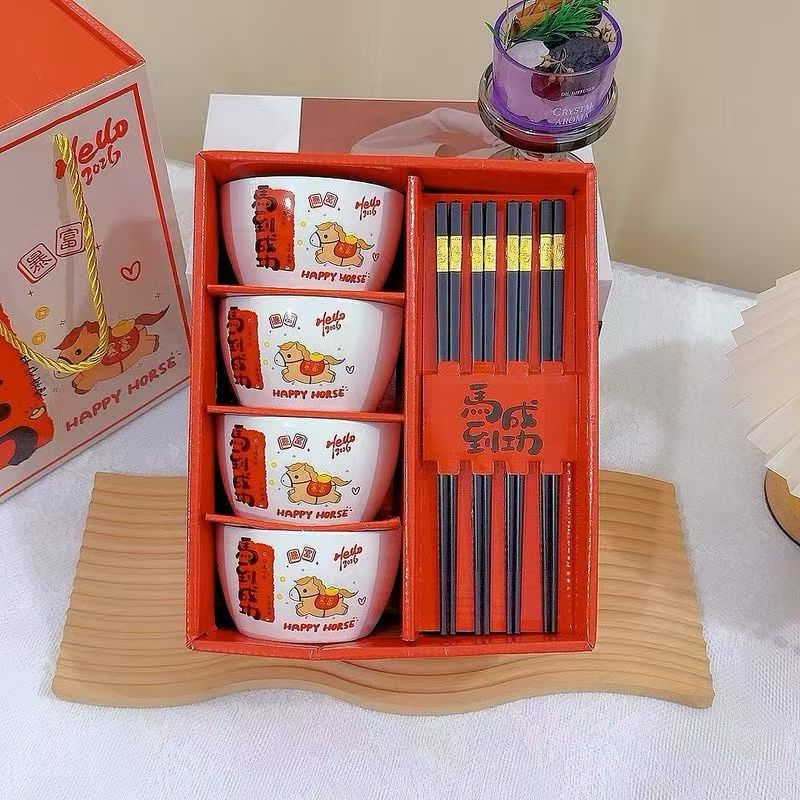 禮盒尺寸:24*13*27cm 外箱尺寸: 62*45*55CM 配 法:4個4.5寸碗+4雙筷子 1.2kg 材 質(zhì):新骨瓷+密胺金屬筷 包裝方式:禮盒包裝 “馬到成功”+“暴富平安”的祝福直接刻在碗上,4碗4筷的配置,自己用討個好彩頭,送朋友更是心意滿滿~紅禮盒一拎,顏值儀式感全拉滿!新的一年,就讓每一餐都吃出自帶好運的快樂?