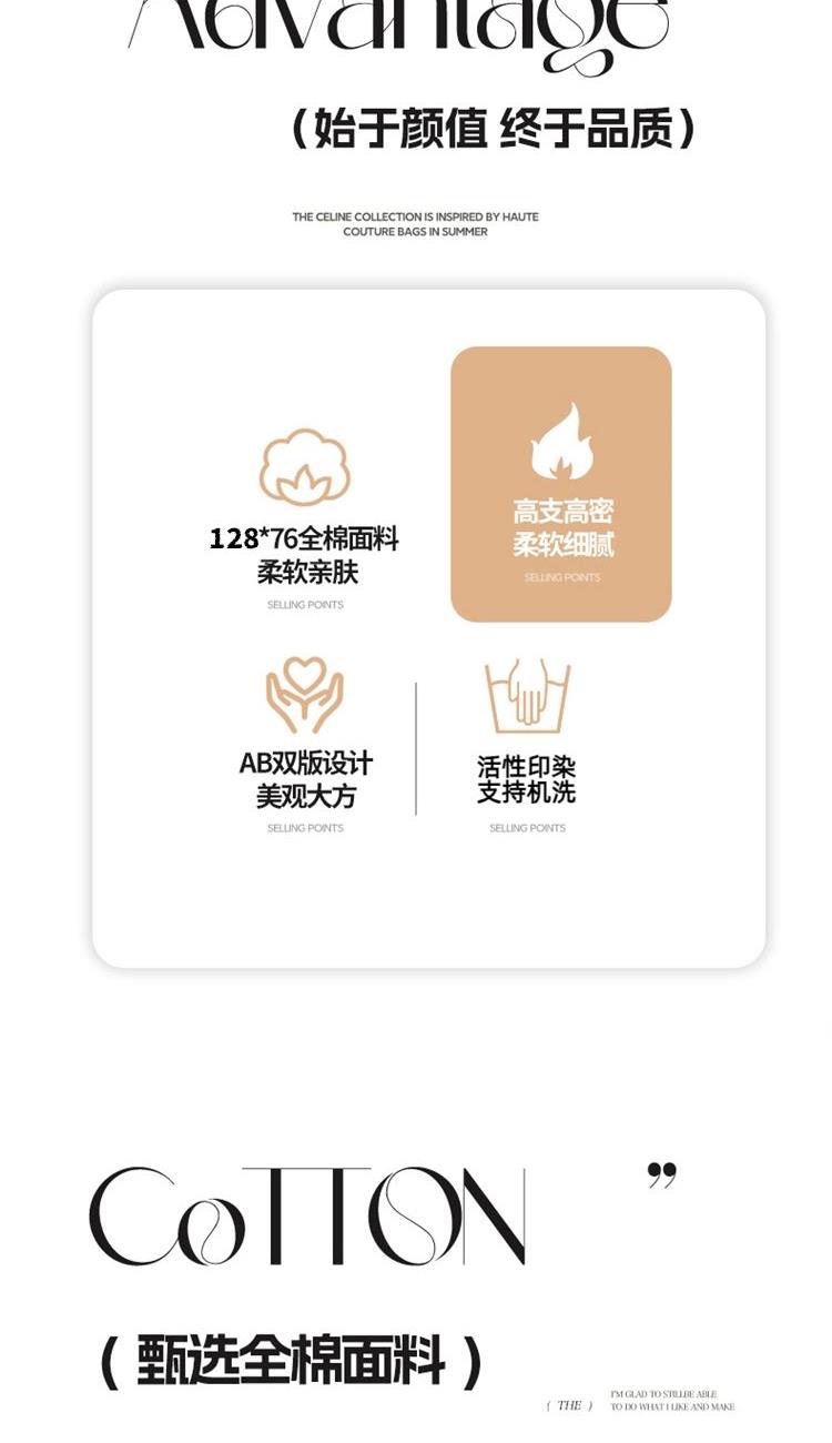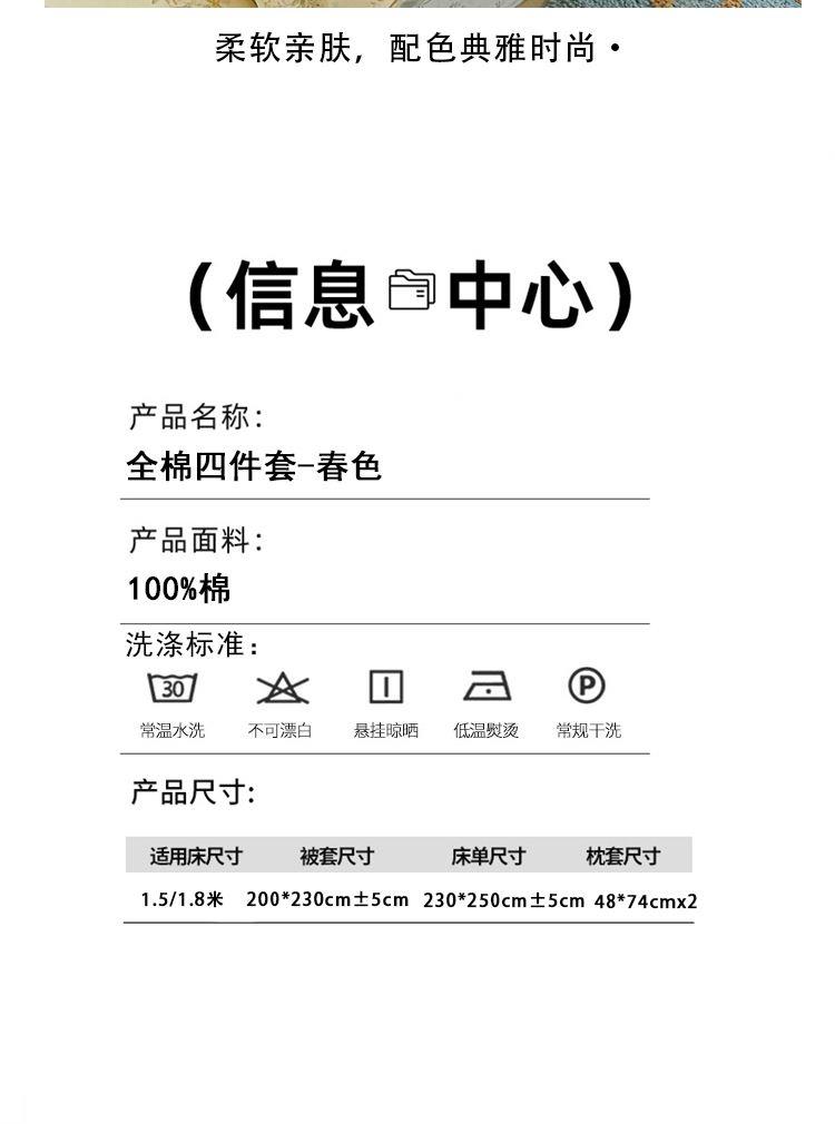 規(guī)格: 床單:230*250cm±5cm 被罩:200*230cm 枕套:48*74cmx2 面料:99%棉 1、優(yōu)選好棉,貼身的更要精挑細(xì)選 2、活性印染工藝,健康環(huán)保,無(wú)甲醛,無(wú)致癌物 3、色調(diào)清新有層次,吸濕親膚舒適,輕薄透氣,縮水率低