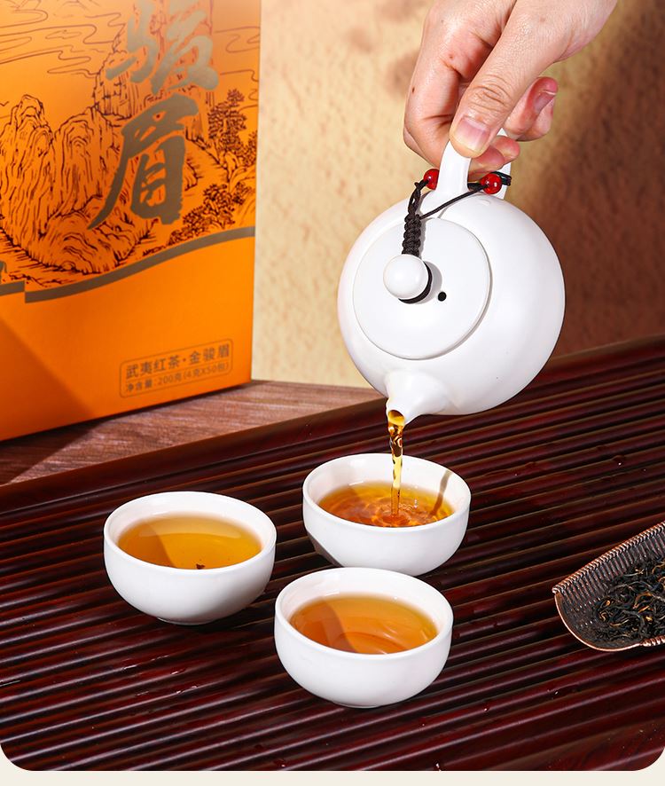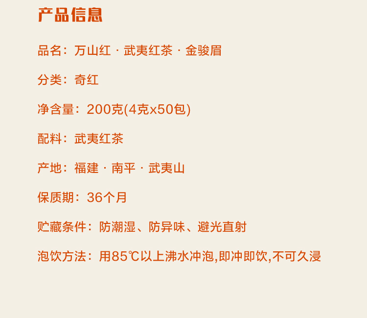 凈含量:200克(4g*50包) 條形碼:6977681511146保質(zhì)期:36個(gè)月 原料產(chǎn)地:福建·南平·武夷山 貯藏條件:防潮濕、防異味、避光直射、冷藏為宜 凈含量:金駿眉單罐400克