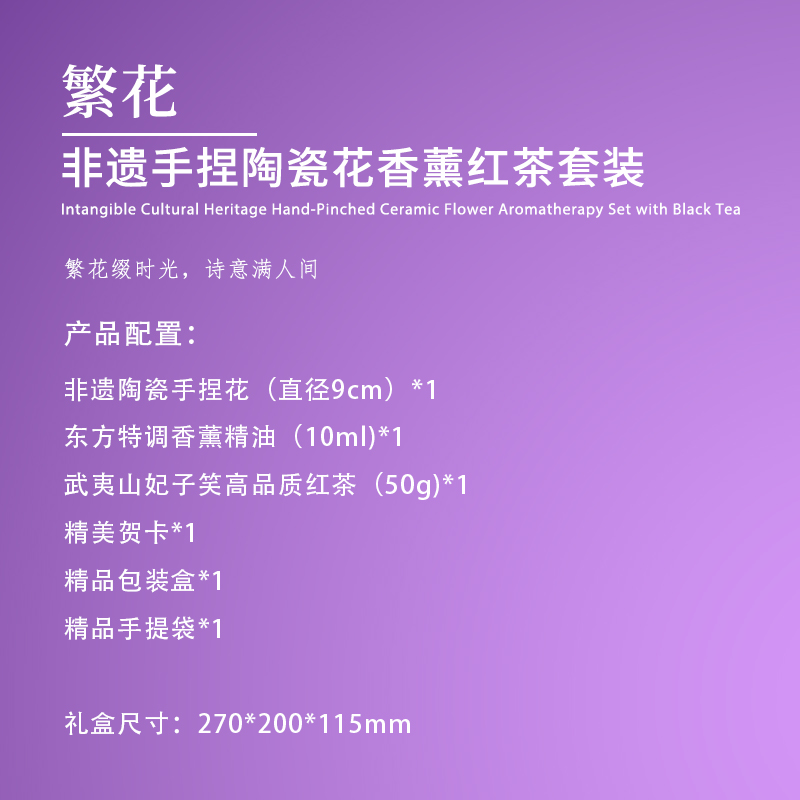 【產品配置】 非遺陶瓷手捏花(直徑9cm) *1 東方特調香薰精油(10ml)*1 武夷山妃子笑高品質紅茶(50g)*1 精美賀卡*1 精品包裝盒*1 精品手提袋*1 【產品說明】 1、9cm非遺手捏陶瓷花,兼具文化價值與藝術裝飾性; 2、武夷山妃子笑紅茶,口感醇厚有保障; 3、一套涵蓋茶品與東方特調香薰,營造雅致生活氛圍; 4、“繁花”主題+紫色調,傳遞詩意氛圍感; 5、配套精美包裝與賀卡,儀式感拉滿。
