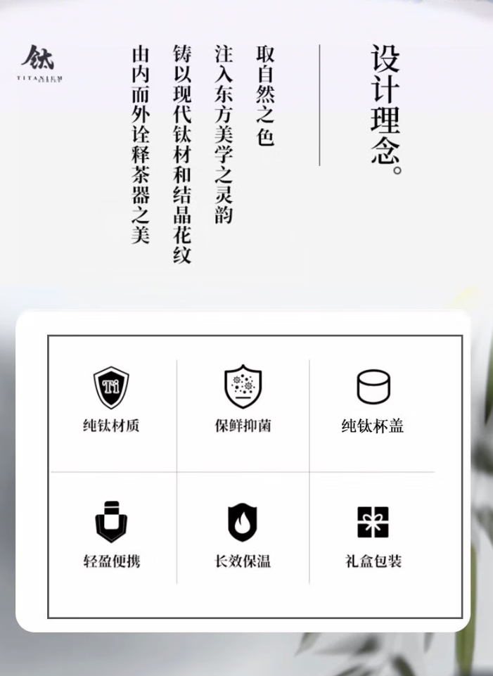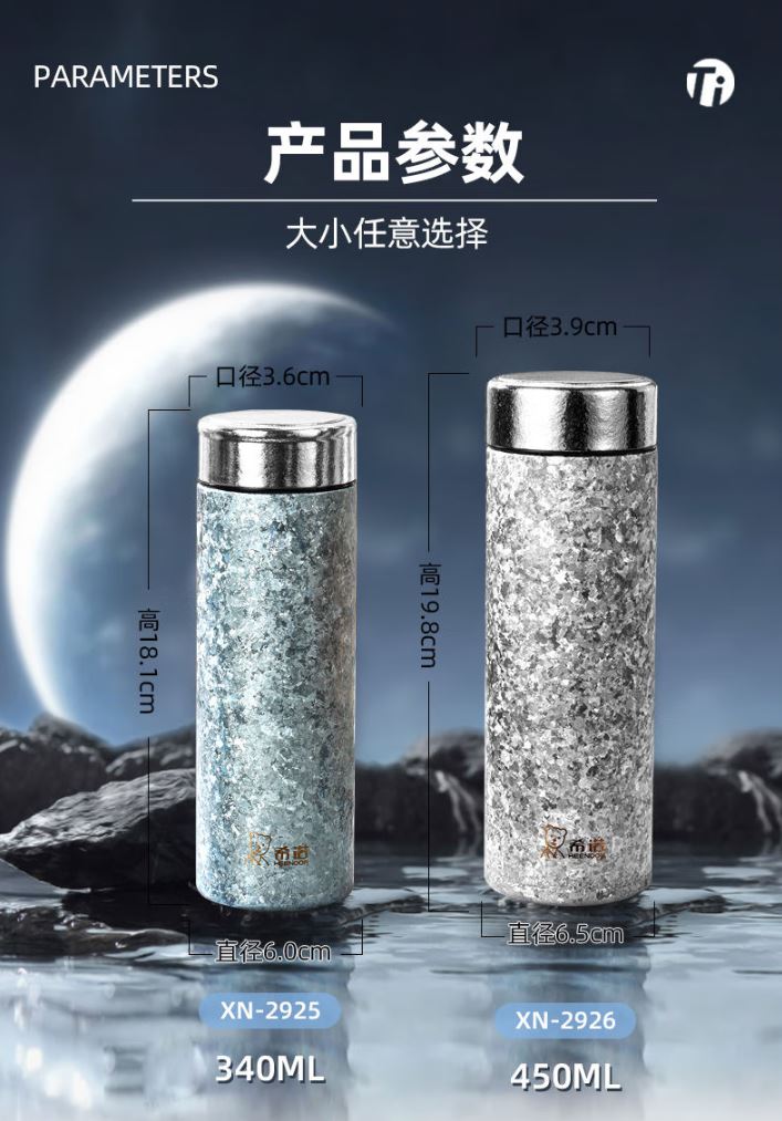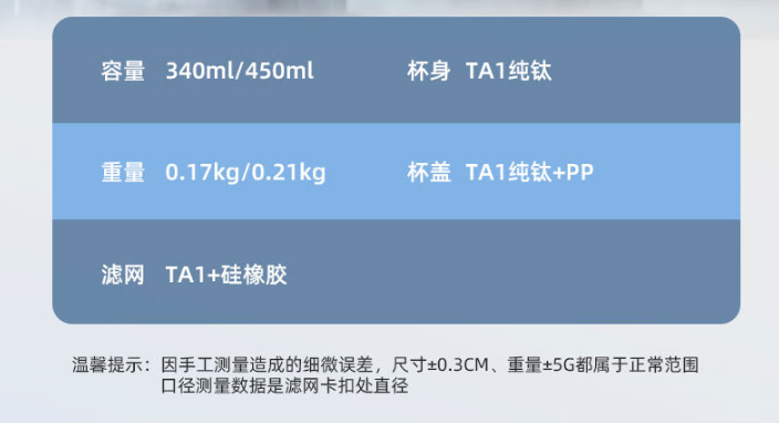 規(guī)格:XN-T2925/18.1*6*口徑3.6cm 顏色:初荷粉、銀月白、遠(yuǎn)天藍(lán) 杯體:TA1純鈦 杯蓋:TA1純鈦+PP 濾網(wǎng):TA1+硅橡膠 產(chǎn)品賣點: 1.方便攜帶,輕巧材質(zhì),隨行隨飲 2.純鈦杯身,y菌耐酸堿 3.夏季可盛放冰鎮(zhèn)飲品,冬季可盛放熱水花茶享受恰到好處的溫度。 4.純鈦內(nèi)膽具有保鮮效果,使用過程中無重金屬析出,且不產(chǎn)生任何異味